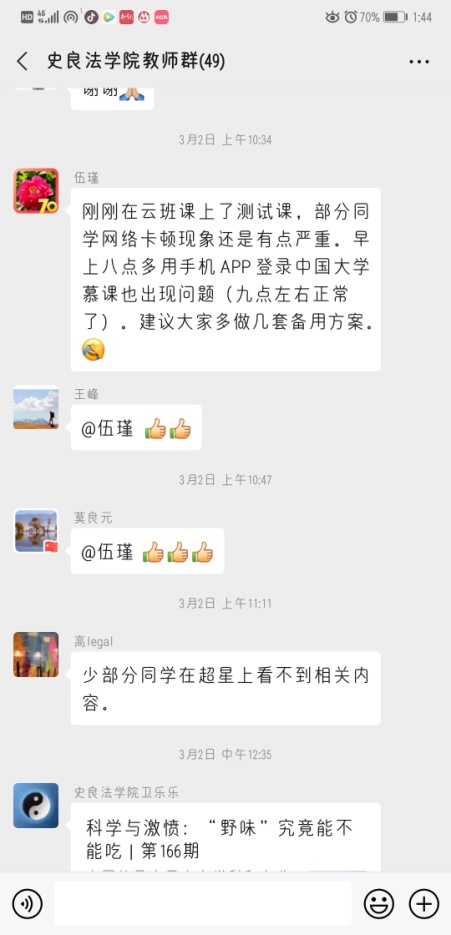 随着居家办公教学的大范围需求,各种适用于网络教学的软件大量涌现,腾讯会议、中国大学慕课、雨课堂、微信、超星、蓝墨云等等,其存在各自的优缺点,偏向于满足不同的需求。“云授课”第一周,beat365教师根据自己的授课需求选择了不同的组合方式,主流教学方法是:以慕课视频完成基础知识单向传授;在腾讯会议、qq群消息、qq语音、雨课堂、蓝墨云班中选择一种实现师生互动交流。